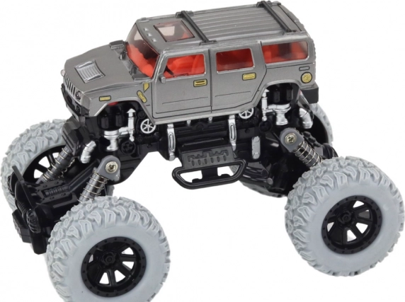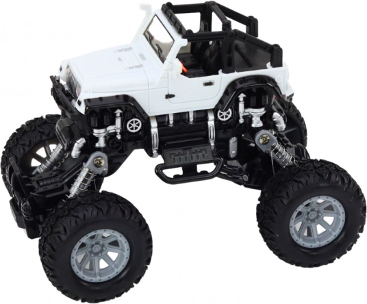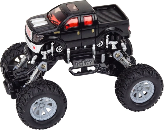 Terenowe auto 4x4 zostało zaprojektowane do dynamicznej zabawy w wymagających warunkach. Wysokie, sprężynowe zawieszenie oraz duże, profilowane koła ułatwiają przejazd przez przeszkody, kamyczki i nierówne podłoże. Realistyczne detale, takie jak zderzaki i boczne elementy, nadają zabawce wygląd prawdziwego auta off-road.