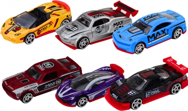- 6 sztuk w opakowaniu – wielokolorowe sportowe autka z różnymi grafikami