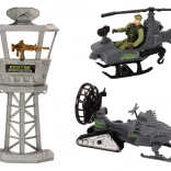 Zestaw zawiera skuter, motocykl terenowy, helikopter i inne akcesoria do szybkich misji w różnych środowiskach.