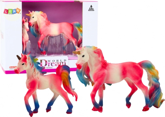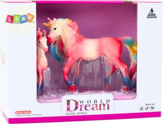 Uroczy zestaw dwóch różowych jednorożców – dorosłego i młodego – do magicznej zabawy i na wystawkę. Realistyczne detale, kolorowa grzywa i ogon, wytrzymałe wykonanie oraz certyfikaty CE, EN71 gwarantują bezpieczną zabawę dla dzieci od 3 lat.