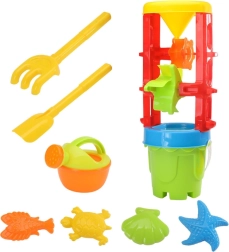 Duży młynek do piasku, wiaderko, łopatka, grabki, konewka, 4 foremki