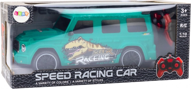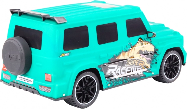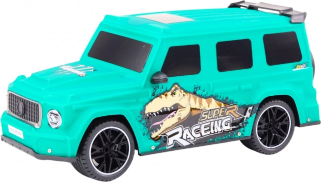 Wyraziste turkusowo-zielone nadwozie z grafiką dinozaura i sportowymi liniami sprawia, że auta na torze nie da się przeoczyć.
