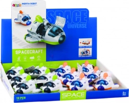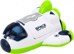 Mała kosmiczna rakieta wyposażona jest w kółka, dzięki którym zabawka może się dynamicznie poruszać do przodu po naciśnięciu, co umożliwia dzieciom aktywną zabawę i symulację prawdziwych misji kosmicznych.
