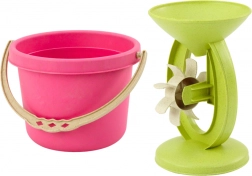 Wlewaj wodę lub wsypuj piasek i obserwuj, jak koła młynka się obracają. Solidne ucho wiaderka ułatwia przenoszenie wody i piasku.