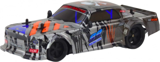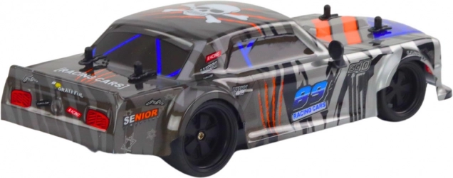 Szara karoseria z pomarańczowymi akcentami i wyścigowymi nadrukami nadaje autu autentyczny wygląd. Niski profil i szerokie koła wspierają stabilność przy wyższej prędkości.