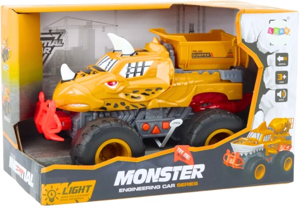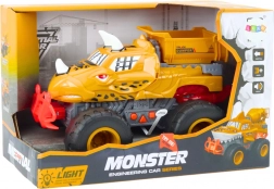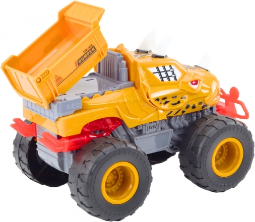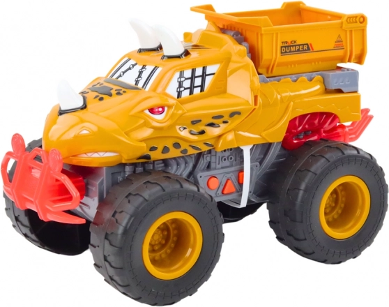 Samochodzik jest zaprojektowany jako dinozaur z zębami i rogami, co przyciąga uwagę każdego dziecka.