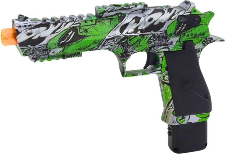 Pistolet wyróżnia się dynamiczną kolorystyką – wykonany jest w intensywnej zieleni, która dodaje mu energii i atrakcyjności. Dodatkowo zdobią go srebrne elementy nadające futurystyczny i nowoczesny wygląd. Całość uzupełnia wzór graffiti, który dodaje miejskiego charakteru i unikalnego stylu przyciągającego uwagę i odróżniającego go od innych zabawek.