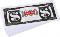 W komplecie znajduje się pakiet imitacyjnych banknotów do natychmiastowej zabawy. Odpowiednie także do innych papierowych rekwizytów o podobnym rozmiarze.