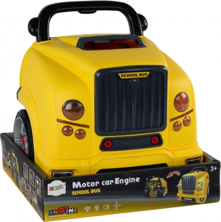 Dziecięcy autobus montażowy – żółty bus warsztatowy z silnikiem do rozkręcania