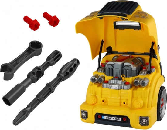 Otwierana maska i odkręcane koła pozwalają dzieciom zajrzeć do wnętrza pojazdu oraz ćwiczyć montaż i demontaż za pomocą dołączonych narzędzi.