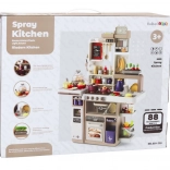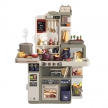 Okap z przyciskiem on/off i funkcją muzyczną odtwarza melodie i włącza światła, co dodaje interaktywności zabawie. Kran z zamkniętym obiegiem wypuszcza wodę za pomocą pompki – bez bałaganu i w pełni pod kontrolą. Zestaw zawiera 74 praktyczne akcesoria (owoce, warzywa, garnki, filiżanki, talerzyki, sztućce, ciasteczka, czekoladki, dzbanek, tabliczkę kredową, jajowar, keczup, musztardę, pieprz, mleko itp.), łącznie 88 elementów.