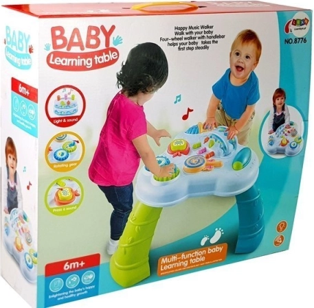Stolik jest stabilny i bezpieczny, wykonany z trwałych, nietoksycznych materiałów, spełniających surowe normy dla zabawek. Zaprojektowany jest tak, aby wspierać samodzielne stanie i pierwsze kroki dziecka. Efekty dźwiękowe stymulują słuch, a różne kolory i kształty aktywują wzrok.