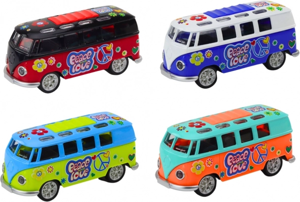 Metalowy autobus Camper w skali 1:32 to nie tylko urzekający model dla dzieci i kolekcjonerów, ale także oferujący szereg funkcji, które potęgują radość z zabawy. Stylizacja na klasycznego kampera z rozmaitymi naklejkami nadaje modelowi unikalny charakter.