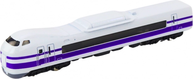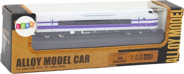 Ten precyzyjnie wykonany metalowy model pociągu w skali 1:48 wyróżnia się trwałością i realistycznym wyglądem. Eleganckie biało‑fioletowe wykończenie oraz starannie dopracowane detale, takie jak okna i drzwi, czynią go atrakcyjnym egzemplarzem dla kolekcjonerów i małych miłośników kolei.
