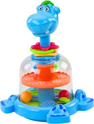 Interaktywny hipcio zachwyca żywymi kolorami i prostą obsługą. Naciśnięcie główki uruchamia w brzuszku mechanizm obrotowy, a 4 kolorowe kuleczki wprawiane są w ruch. Dzieci obserwują, jak kuleczki skaczą i zmieniają kierunek, co pobudza ich ciekawość i koncentrację.