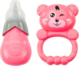 Lalka w różowej sukience z butelką i grzechotką, z dźwiękami i funkcją siusiania