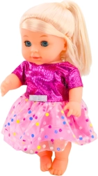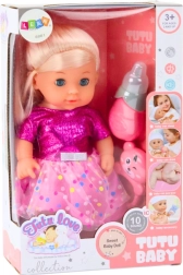 Urocza lalka w różowej sukience w kropki ucieszy każde dziecko. Oferuje realistyczną zabawę dzięki funkcji siusiania po napojeniu z butelki, zabawne efekty dźwiękowe oraz ruchome kończyny. W zestawie znajduje się także grzechotka dla jeszcze większej frajdy i rozwoju wyobraźni.