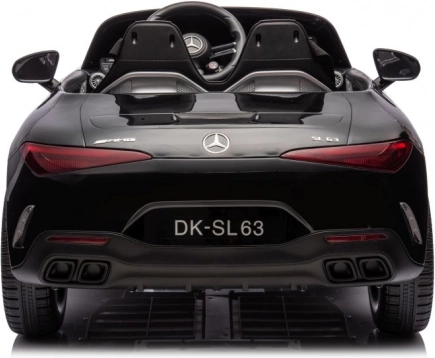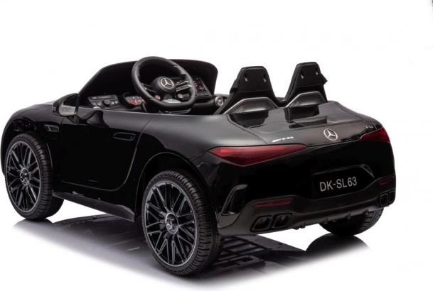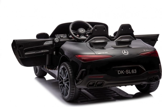 Stylowy dziecięcy elektryczny samochodzik MERCEDES AMG SL63 w eleganckim czarnym kolorze zapewnia realistyczne wrażenia z jazdy dzięki dopracowanym detalom, otwieranym drzwiom, sportowej kierownicy oraz dwóm siedzeniom z pasami. Idealny dla małych kierowców, którzy kochają luksusowy design i zabawę na świeżym powietrzu.