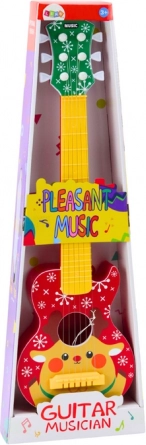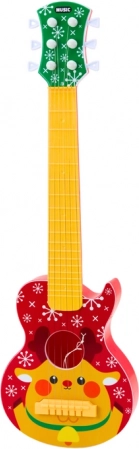 Dziecięca gitara z motywem renifera, metalowe struny, regulacja naciągu, kostka na sznureczku. Certyfikaty CE, EN71. Idealna dla dzieci od 3 lat.