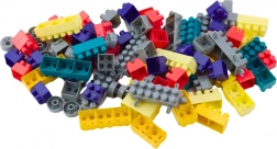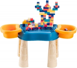 Stolik posiada zabawkową powierzchnię, na której dzieci mogą budować różne konstrukcje z kolorowych klocków.