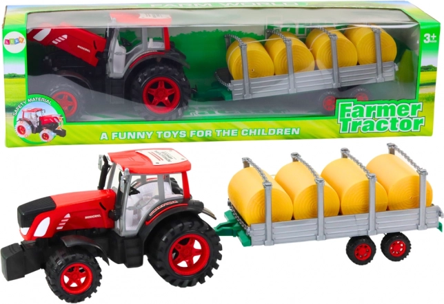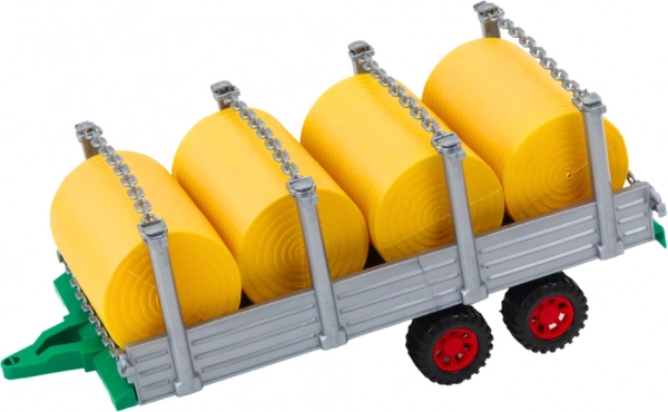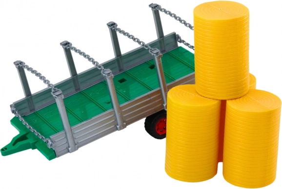 Do traktora należy przyczepa, która zawiera żółte cylindryczne bele siana. Umożliwia dzieciom symulację transportu ładunku, co zwiększa realizm zabawy.