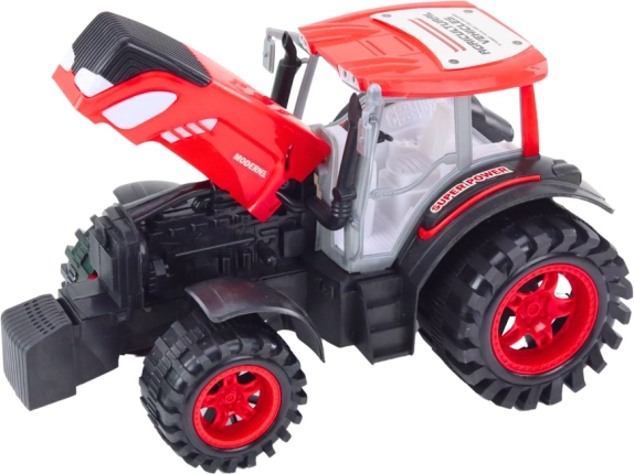 Traktor posiada otwieraną maskę i szczegółową kabinę, które pozwalają dzieciom lepiej poznać, jak wygląda prawdziwy sprzęt rolniczy.