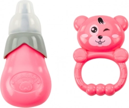 Zestaw zawiera butelkę do karmienia niemowląt, która po napełnieniu wodą umożliwia "siusianie" lalki. Grzechotka wspiera rozwój motoryczny i koordynację.