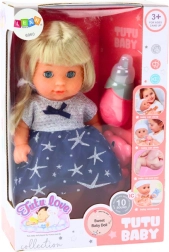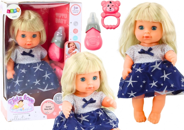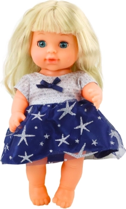Elegancka lalka w marynarskiej sukience z długimi blond włosami oferuje możliwość czesania i stylizacji w różne fryzury. Jej realizm podkreślają ruchome kończyny i zamykające się oczy, które imitują niemowlęce zamykanie oczu podczas snu.