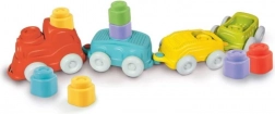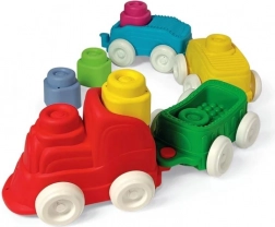 Lokomotywa i trzy wagoniki łatwo się łączą i rozłączają, więc dzieci mogą tworzyć własne składy. Koła zapewniają płynny ruch pociągu, co wspiera aktywną zabawę i rozwój wyobraźni. Klocki można wkładać do wagoników lub budować z nich stabilne wieże – idealne do pierwszych konstrukcji i kompozycji.