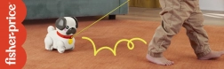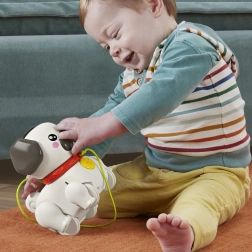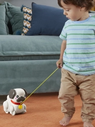 Gdy dziecko pociągnie za sznurek, mops zaczyna poruszać uszkami i łapkami oraz wydaje radosne szczekanie, które zachęca do dalszego odkrywania.