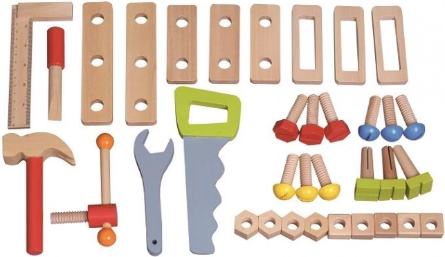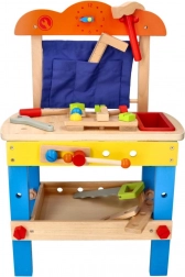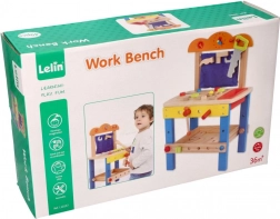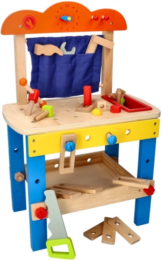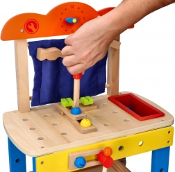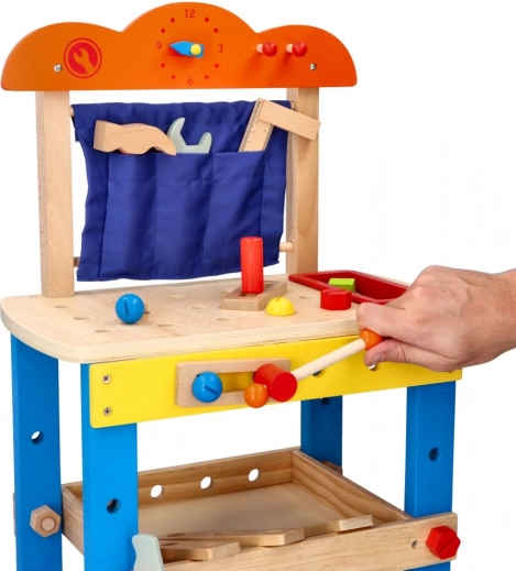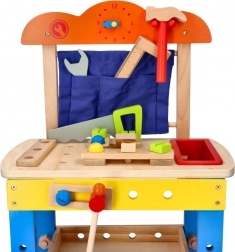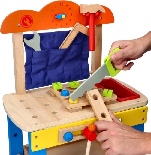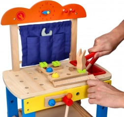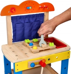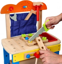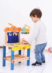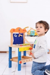 Dzięki kompaktowym wymiarom i wysokości blatu 34 cm warsztat idealnie sprawdzi się w pokoju dziecięcym. Wykonany z drewna i dostarczany z bogatym zestawem narzędzi, pobudza samodzielność, cierpliwość i logiczne myślenie.