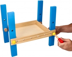- Drewniany warsztat + zestaw narzędzi (młotek, piła, śrubokręt, klucz, śruby, nakrętki, kółka zębate i inne elementy)