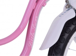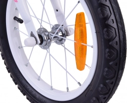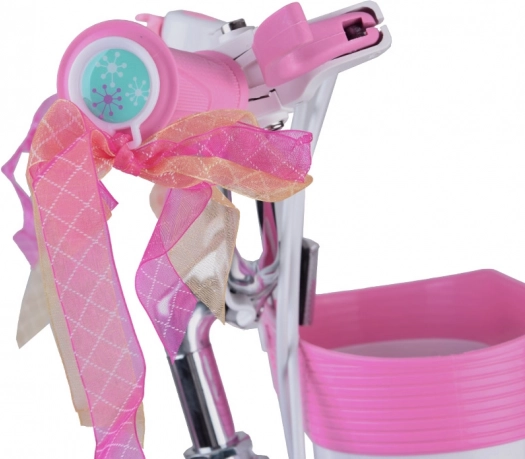 Ergonomiczna kierownica z miękkimi chwytami, dzwonkiem i frędzlami ucieszy małe rowerzystki, a połączenie przedniego hamulca szczękowego i tylnego bębnowego gwarantuje płynne i bezpieczne hamowanie. Kółka boczne dodają stabilności podczas nauki, a praktyczny koszyk pomieści drobiazgi. Komfort prowadzenia uzupełnia miękkie, regulowane na wysokość siodełko z uchwytem do prowadzenia.