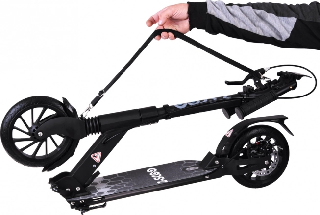 Mechanizm „one hand” pozwala złożyć hulajnogę w kilka sekund. Dołączony pasek na ramię ułatwia przenoszenie w komunikacji miejskiej i po schodach.