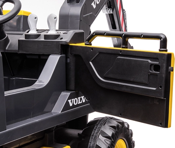 Para dźwigni i joysticków umożliwia precyzyjne podnoszenie, opuszczanie i nabieranie. Dzieci doświadczą prawdziwej pracy operatora koparki marki VOLVO.
