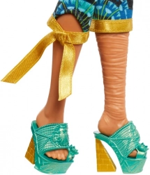 Lalka Cleo De Nile szykuje się na najgorętsze muzyczne wydarzenie roku – Monster Fest! Wyróżnia się topem ze złotymi rękawami, spodniami w barwach klejnotów oraz koroną z motywem lotosu, która podkreśla jej długie niebieskie włosy. Dzięki przegubom łatwo ustawisz cool pozy do zdjęć i odgrywania historii.