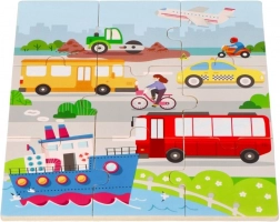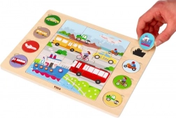 Dzięki solidnemu drewnu i gładkim krawędziom gra jest bezpieczna od 18 miesięcy. Pogodne kolory i wyraźne kształty przyciągają uwagę i pomagają lepiej poznać samochody, autobusy, statki, samoloty i inne środki transportu. Po ukończeniu dziecko może nazywać pojazdy i wyszukiwać je na dużym obrazku – świetna aktywność wspierająca rozwój mowy.
