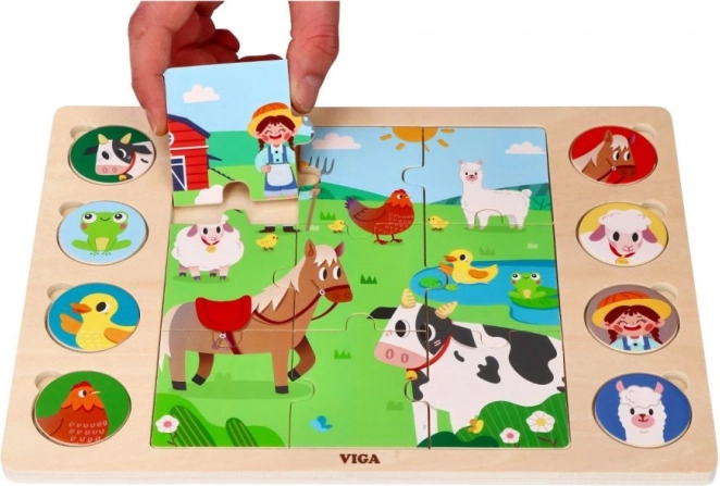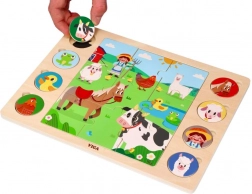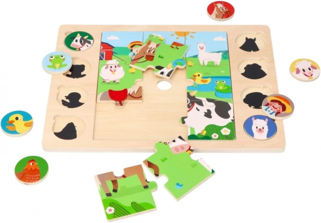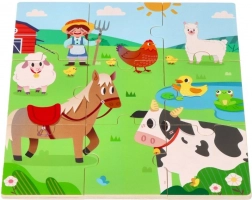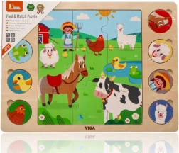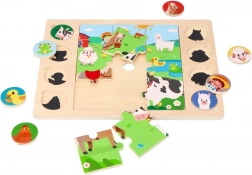 Te pomysłowe puzzle łączą dwie aktywności: najpierw dzieci układają środkowy obrazek z 9 dużych elementów, a następnie dopasowują 8 okrągłych żetonów ze zwierzątkami do odpowiadających im cieni na planszy. Zabawa naturalnie wspiera rozwój słownictwa – po zakończeniu układania dzieci mogą nazywać zwierzęta i odnajdywać je na dużej ilustracji farmy.