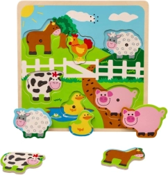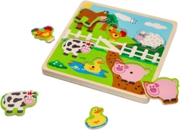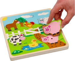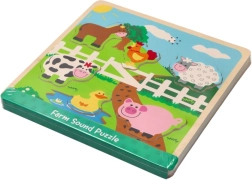 Drewniane puzzle dźwiękowe z motywem farmy wprowadzają dzieci w świat kształtów, kolorów i dźwięków. Każdy element przedstawia znane zwierzę gospodarskie, a po umieszczeniu we właściwym miejscu rozlega się charakterystyczny odgłos, który wspiera naturalną ciekawość i koncentrację.