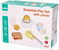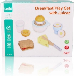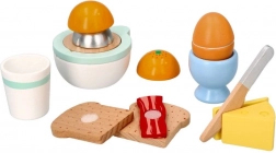 - Kompletne akcesoria śniadaniowe: tosty, ser, jajko w kieliszku, kubeczek, drewniany nożyk oraz funkcjonalna ręczna wyciskarka z pomarańczą.