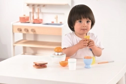Manipulowanie jajkiem w kieliszku, tostami i nożykiem ćwiczy chwyt, koordynację oraz wyobraźnię podczas zabaw w odgrywanie ról.