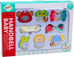 Kolorowe opakowanie z napisem 'Handbell Baby' gwarantuje, że zestaw grzechotek przyciągnie uwagę i będzie świetnym prezentem dla najmłodszych.