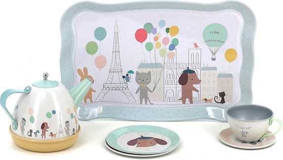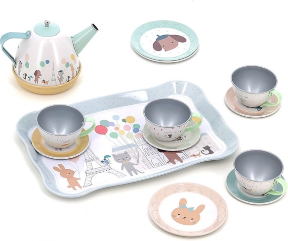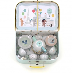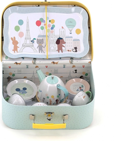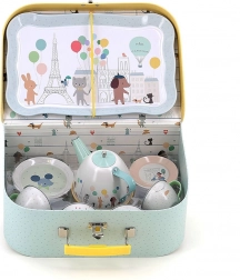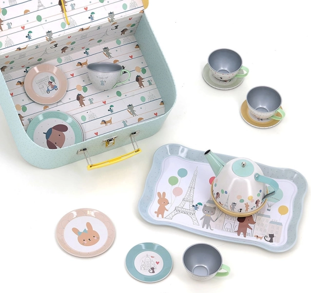 Uroczy zestaw zawiera 14 elementów ilustrowanych przez Sarah Betz, które przywołują klimat Paryża dzięki subtelnym kolorom i motywom. W skład zestawu wchodzą taca, czajniczek oraz cztery filiżanki ze spodkami, idealne do zabawnych herbacianych spotkań. Dzięki praktycznej walizeczce zestaw można łatwo przenosić i używać także w podróży.