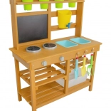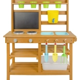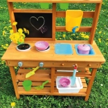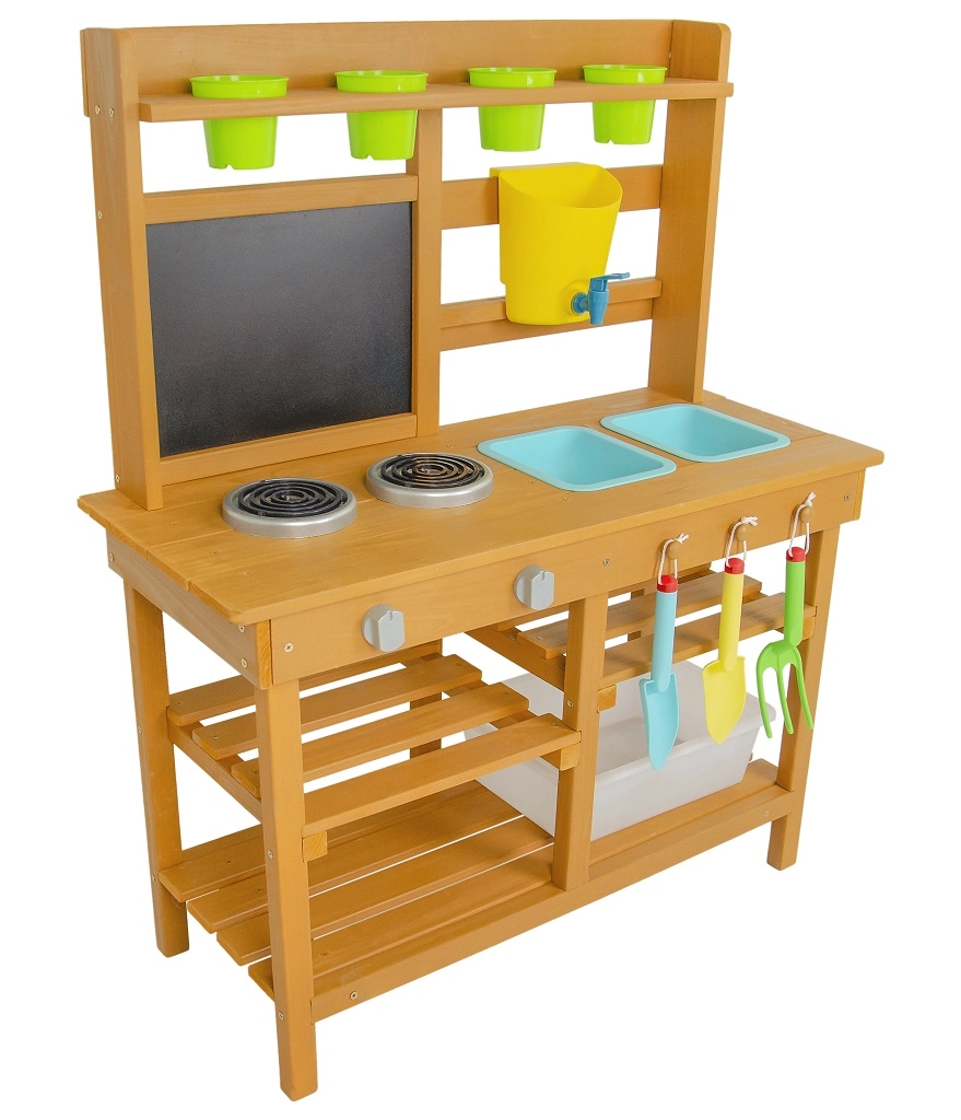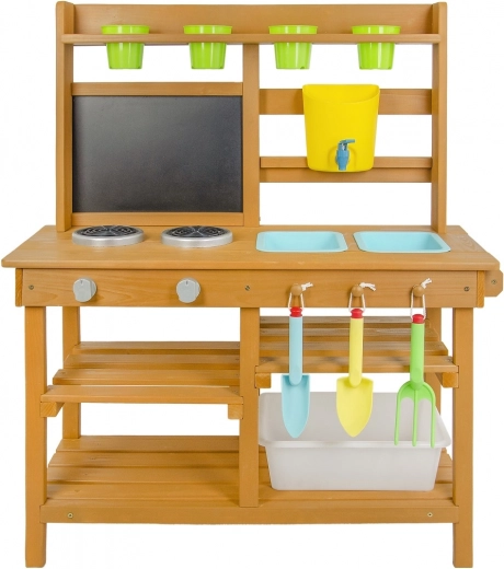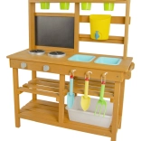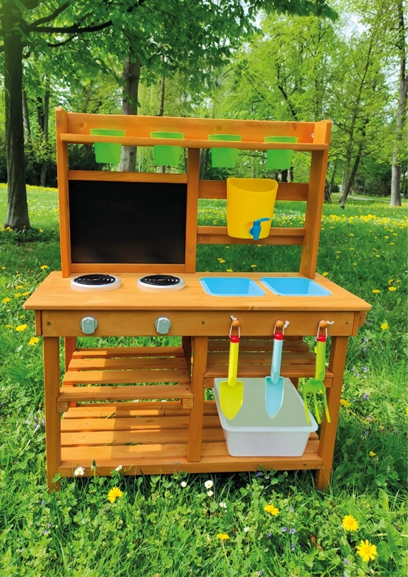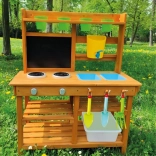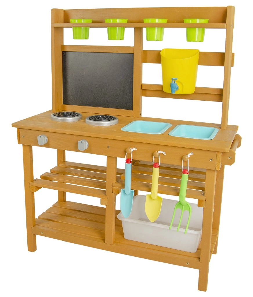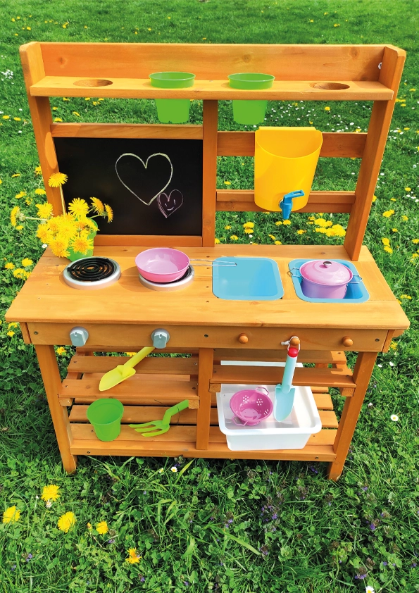 Oferujemy przekąskę prosto pod horyzontami natury! W miejscu, gdzie potrawy pachną świeżym powiewem wiatru, a słońce piecze bochenki z piasku i wody. Ta kuchnia ogrodowa oferuje świetną możliwość rozwijania u dzieci kreatywności, samodzielności i doskonalenia swoich kulinarnych umiejętności na świeżym powietrzu. Wyposażona w przydatne elementy, takie jak kran, kuchenkę, przybory kuchenne (w postaci łopatki i małych grabek) czy wiaderka. Przestronne schowki z pewnością będą przydatne. Jakie jest dzisiejsze menu? Czysta fantazja! Główne cechy: kompaktowe wymiary, w zestawie akcesoria wielofunkcyjne, różnorodne zastosowanie obszerny schowek