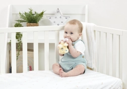 Dzięki kompaktowym wymiarom świetnie mieści się w rączce, wózku i torbie podróżnej. Neutralne, kojące barwy oraz miękka pluszowa powierzchnia są idealne do codziennego tulenia i pierwszych odkryć.