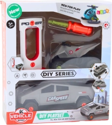 Kreatywny zestaw dla małych techników: szare nowoczesne auto, quad i stacja ładowania do samodzielnego montażu. Dzieci ćwiczą małą motorykę i poznają podstawy mechaniki dzięki przykręcaniu i składaniu. W zestawie śrubokręt. Zabawka wykonana z wysokiej jakości materiałów, posiada certyfikat CE i spełnia normę EN71, odpowiednia dla dzieci od 3 lat.