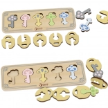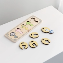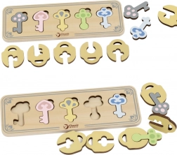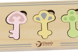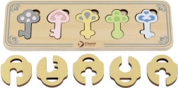 Dzieci dopasowują każdy klucz do odpowiadającego mu wycięcia, wzmacniając logiczne myślenie oraz postrzeganie kształtów i kolorów.