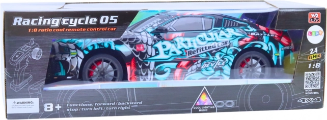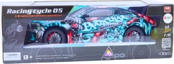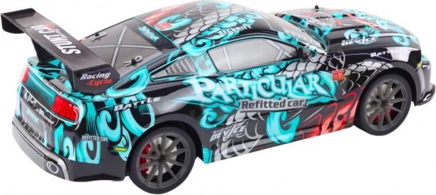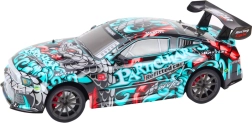 Stylowy wzór graffiti w czarnym i turkusowym kolorze nadaje autu nowoczesny wygląd inspirowany prawdziwymi samochodami wyścigowymi.