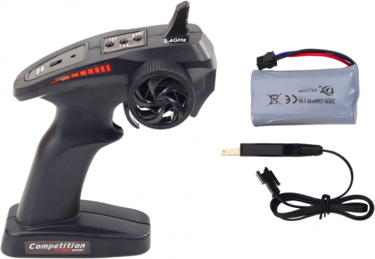 Kontroler o sportowym designie z sygnałem 2.4 GHz zapewnia precyzyjne i stabilne sterowanie modelem auta dla najlepszych wrażeń z zabawy.