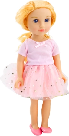 Piękna sukienka z tiulową spódnicą, zdobiona złotymi gwiazdami, nadaje lalce baśniowy wygląd, gotowy na każdą specjalną okazję. Detale i materiały wysokiej jakości zapewniają przyjemny dotyk i łatwą manipulację, co ułatwia zabawę i rozwój dziecięcej koordynacji.